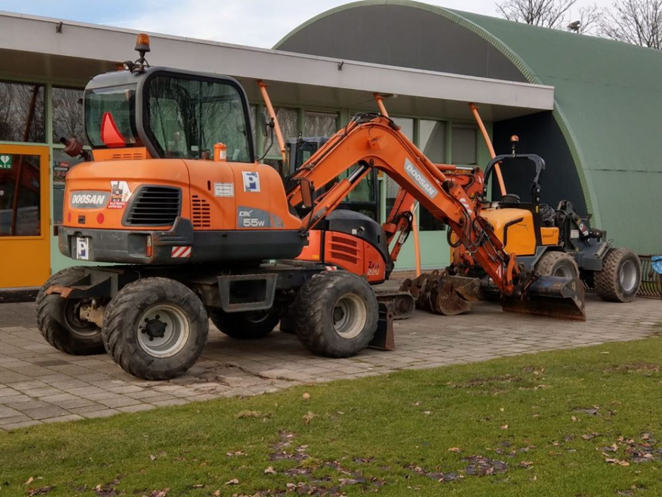 Vandaag 12 februari zijn de werkzaamheden aan het terras, fietsenstalling en het entree begonnen. Met groot materiaal werd vanmorgen vele tegels en het gras verwijderd en gaat men met de nieuwe indeling aan de gang. Het kan dus wel eens voorkomen dat de fietsen ergens anders dan normaal moeten worden geplaatst of men door het zand zal moeten lopen.
