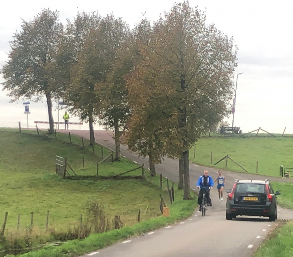 Trainer Rob van der Valk ging mee op de fiets om op vaste afstanden sportdrank aan te reiken en – op verzoek van de organisatie – ook te fungeren als voorfietser.